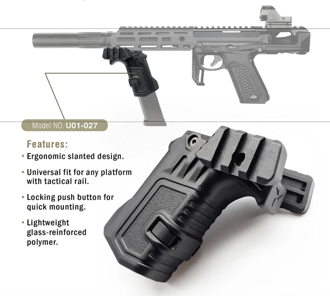 Turn your spare magazine into a foregrip Compatible with Picatinny platforms Durable polymer construction Features integrated Picatinny rails for extra attachments Ergonomic slanted design