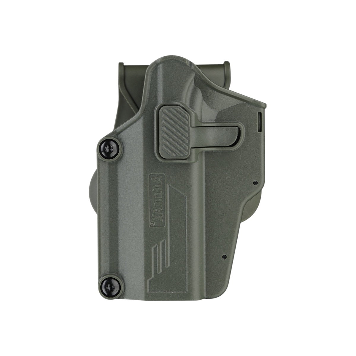AMOMAX® holsters are constructed from precision moulded, durable polymer and are designed for tactical and law enforcement training use. Renowned for their active retention system, they feature a reliable trigger guard locking mechanism with a quick-release push button for both secure storage and rapid draw.  The Per-Fit™ range of holsters boast universal compatibility with over 80 different pistol models via the adjustable tension system, providing a practical solution and alternative to having separate holsters for each individual pistol. The Per-Fit™ range also supports multiple mounting options including paddle, MOLLE, belt clip and drop-leg platforms.
