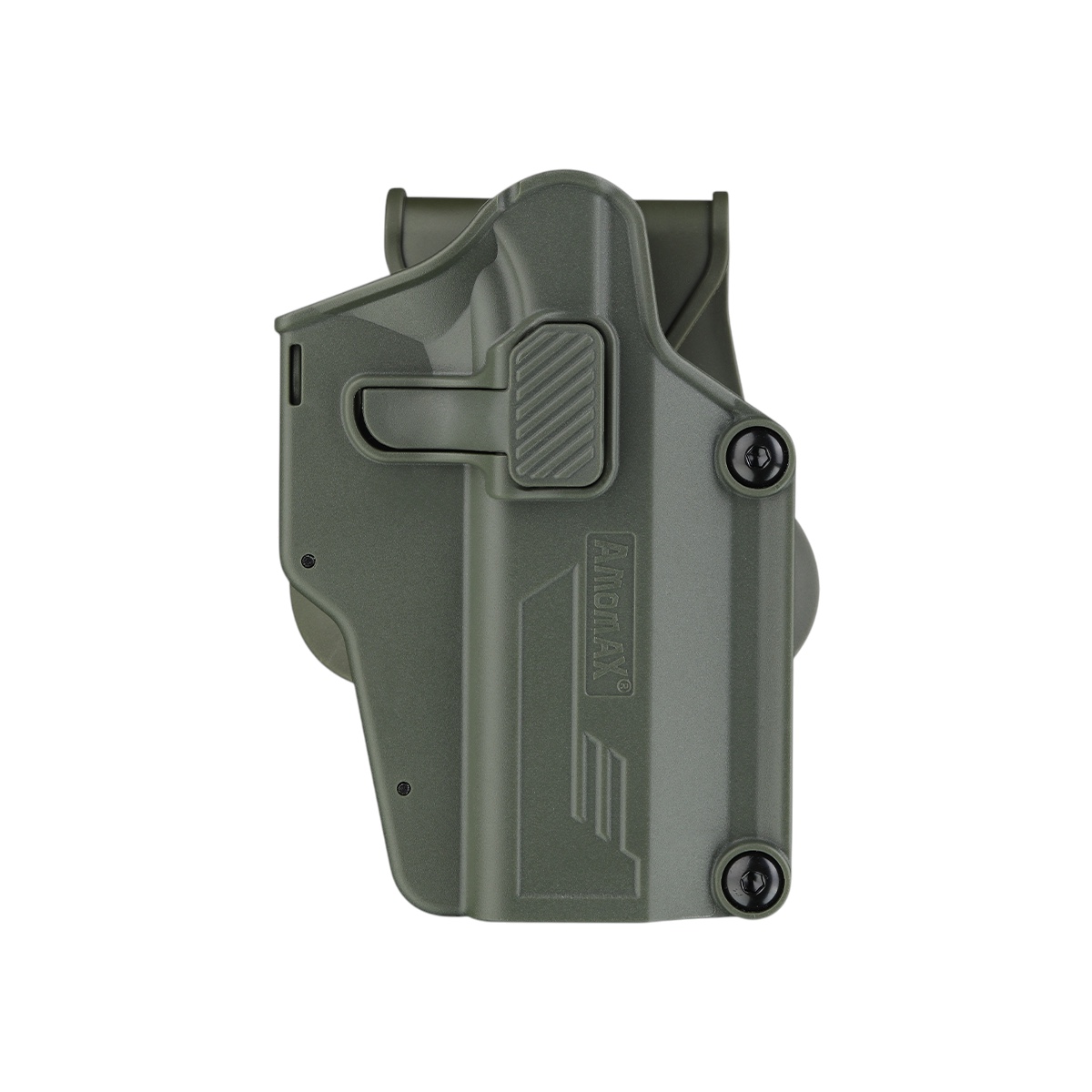 AMOMAX® holsters are constructed from precision moulded, durable polymer and are designed for tactical and law enforcement training use. Renowned for their active retention system, they feature a reliable trigger guard locking mechanism with a quick-release push button for both secure storage and rapid draw.  The Per-Fit™ range of holsters boast universal compatibility with over 80 different pistol models via the adjustable tension system, providing a practical solution and alternative to having separate holsters for each individual pistol. The Per-Fit™ range also supports multiple mounting options including paddle, MOLLE, belt clip and drop-leg platforms.