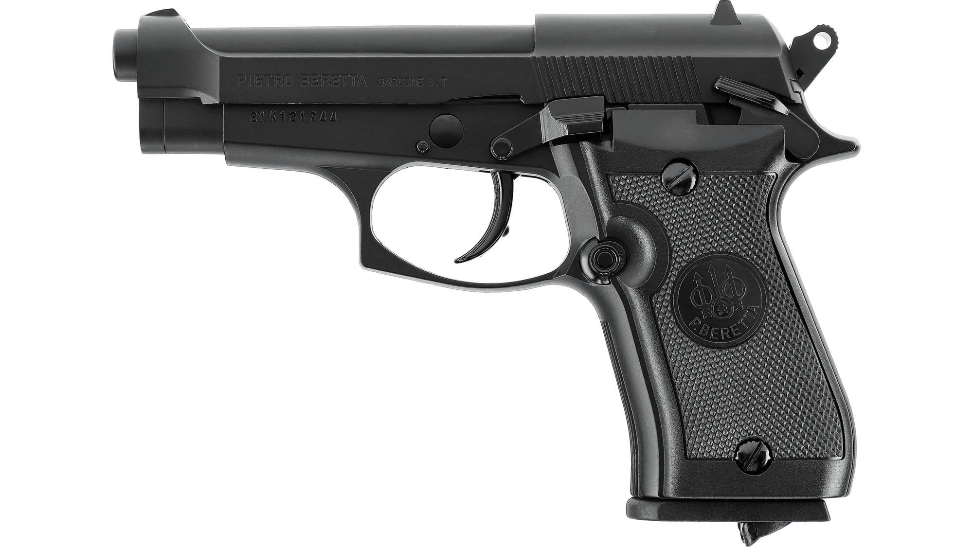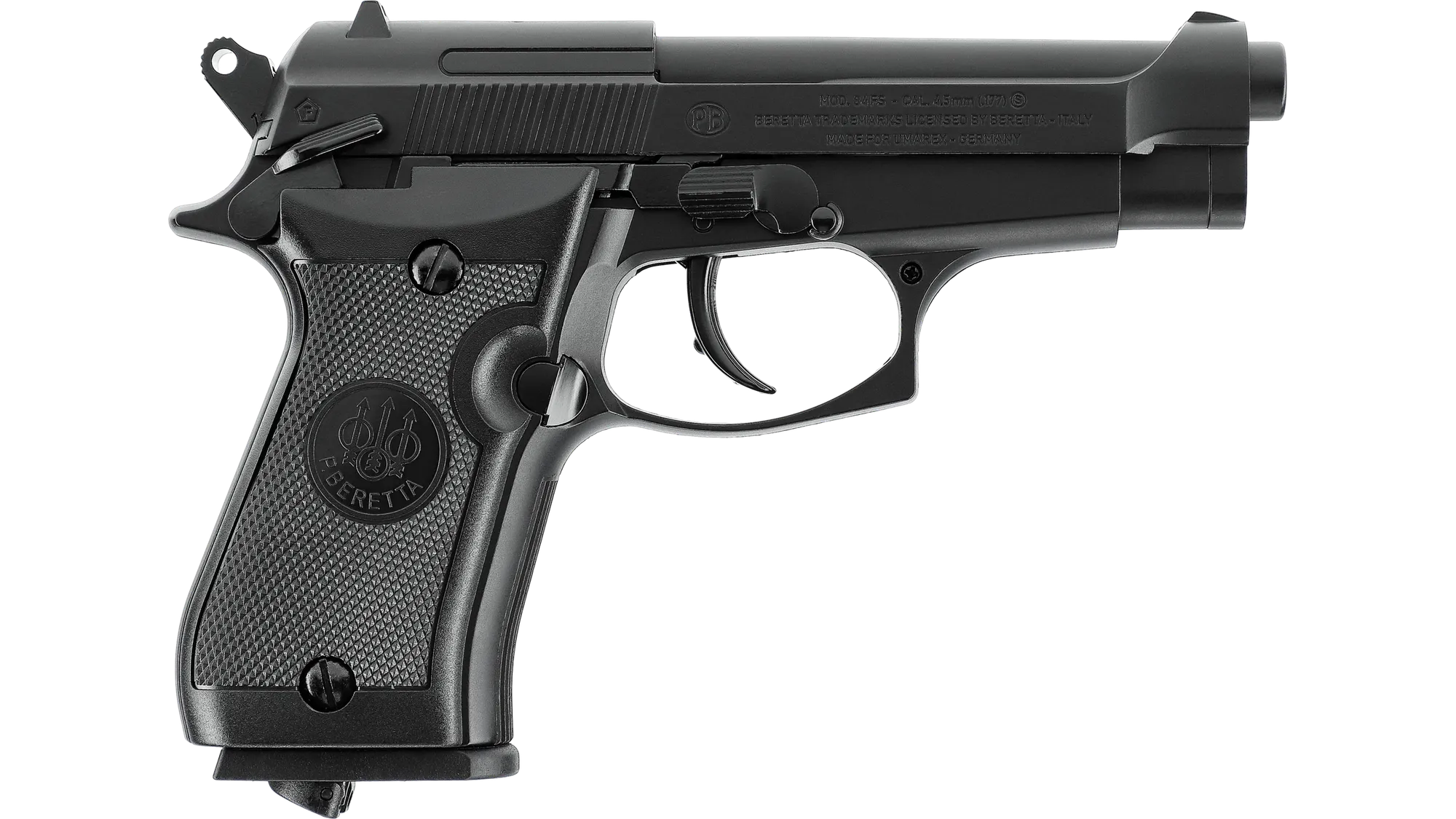 This CO₂ replica of the Beretta Mod. 84 FS has all the fine qualities of the original: it fits well in the hand and is easy to operate. The rugged all-metal gun has a removable magazine that holds 17 4.5mm BBs and a 12g CO₂ capsule. A slide stop, ambidextrous safety and stripping lever offer realistic handling and training. With its high energy and powerful blowback effect, this pistol makes a truly authentic impression. Manufactured by Umarex, Germany.