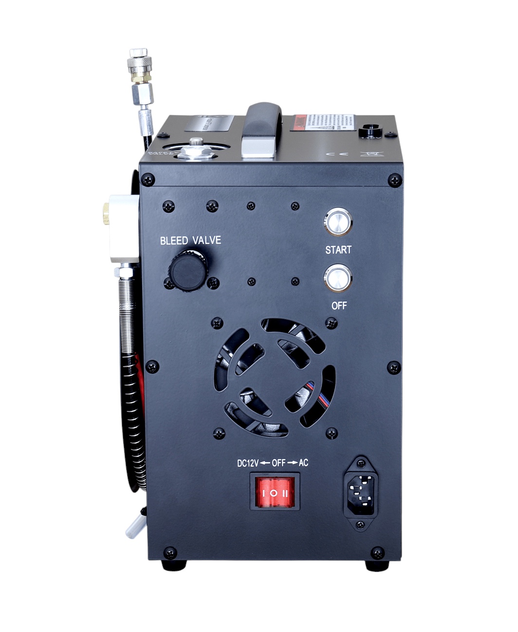 The BSA Portable Electric Compressor is a high performance, dual voltage air compressor designed specifically for pre-charged pneumatic (PCP) air guns. Compact and portable, it operates on both 240V mains power and 12V DC (via vehicle battery) making it ideal for home use or out in the field. This oil free, air cooled unit delivers a maximum fill pressure of up to 320 bar and features an integrated pressure gauge with automatic shut off, allowing users to set a target pressure and walk away with peace of mind during operation. It can top up a 0.3L airgun cylinder from 200 to 300 bar in around 8 minutes. Weighing just under 10 kg and equipped with built-in handles, the compressor is easy to transport and store. Its self-contained design includes a moisture separator and requires minimal maintenance, while its robust construction ensures robust reliability over repeated use. A fast, convenient and efficient solution for all PCP air gun users.