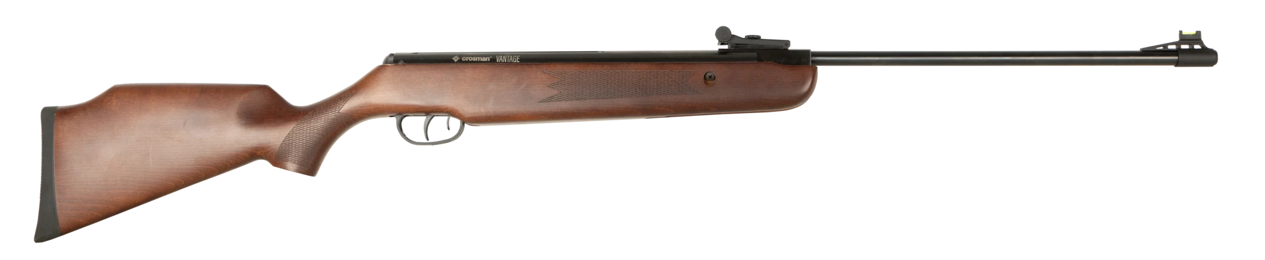 The Crosman Vantage spring powered air rifle boasts a dark beech wood stock, rifled-steel barrel and lever safety for a traditional feel. The Vantage features an adjustable two-stage trigger, fibre optic sights and Dovetail mounting rail. Made by Crosman, U.S.A.