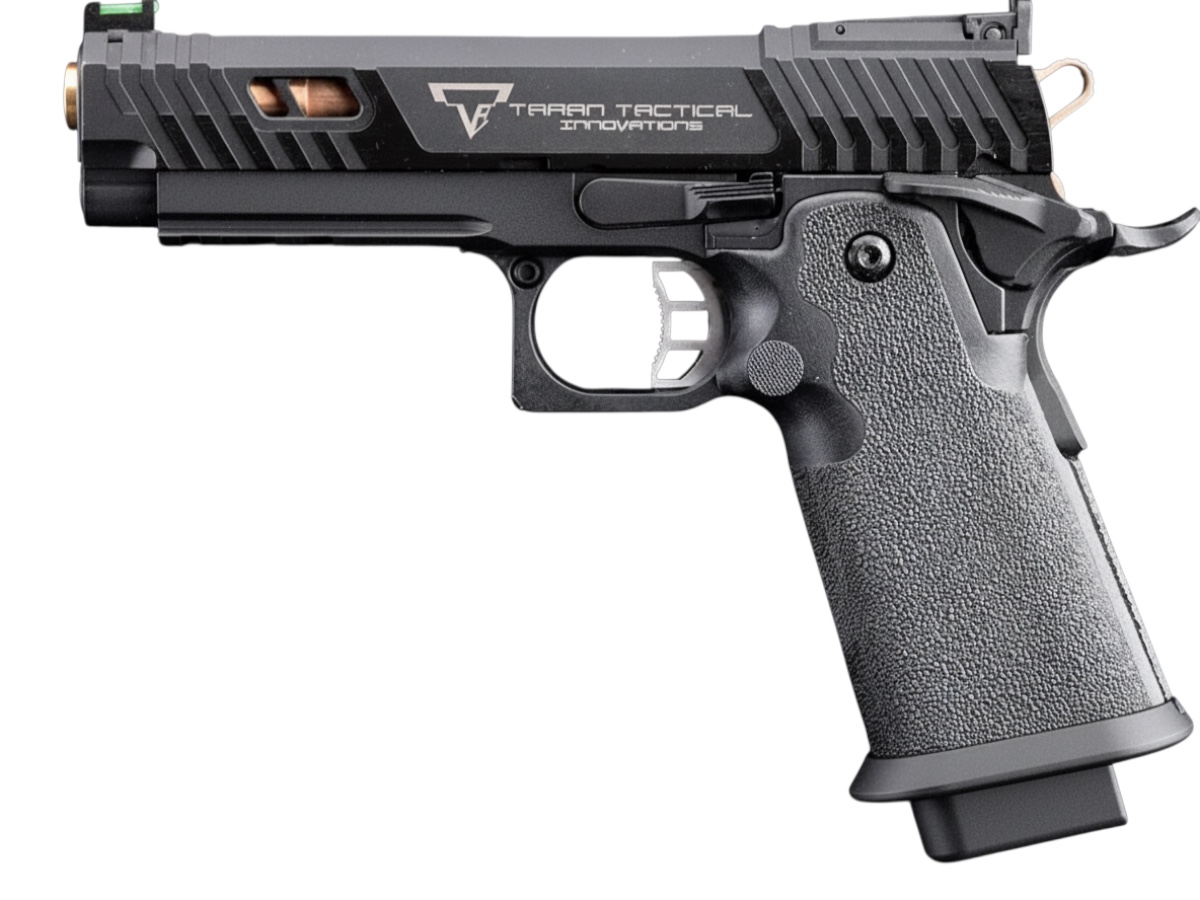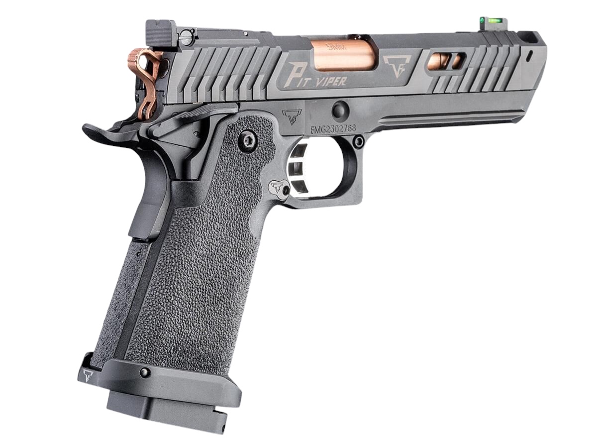 The EMG x Taran Tactical Innovations Pit Viper is a fully licensed Airsoft GBB pistol that is patterned after the sidearm used in the movie “John Wick”. This pistol is the official, premium reproduction and boasts excellent ergonomics plus enhanced handling via the faux stippling on the grip. This pistol also features an ambidextrous safety for ease of use. Included in the box is an official EMG x Taran Tactical Innovations 30x round gas magazine.