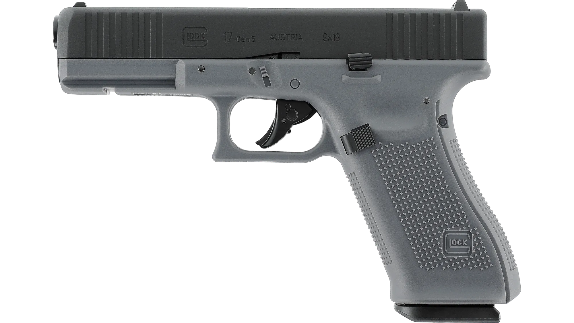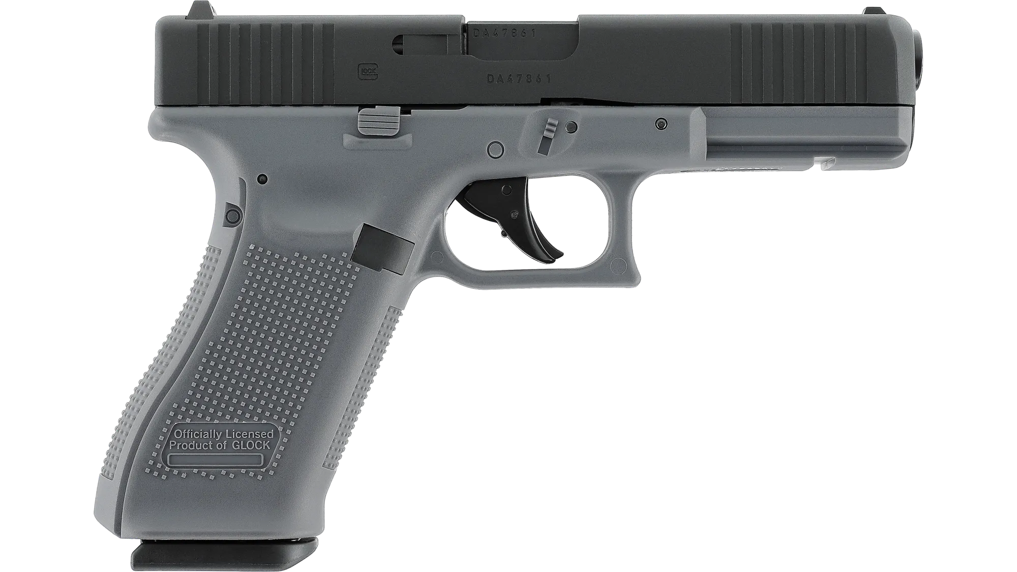 The CO₂ operated Glock 17 Gen5 is a pistol with powerful blowback. Standard features include a metal slide, durable polymer frame and an all-in-one magazine that holds 18 steel BBs along with the CO₂ capsule itself. It also features an ambidextrous slide lever which makes it perfect for both right and left handed operators. The metal slide blows back with every shot, producing a strong recoil, and the rail allows for attachment of accessories such as torches and lasers. Manufactured by Umarex, Germany.