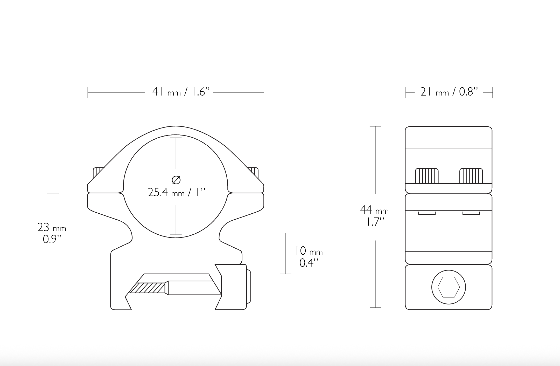 Compatible tube size: 1” Mount type: Weaver/RIS Material: Aluminium Height: 44mm Weight: 82g