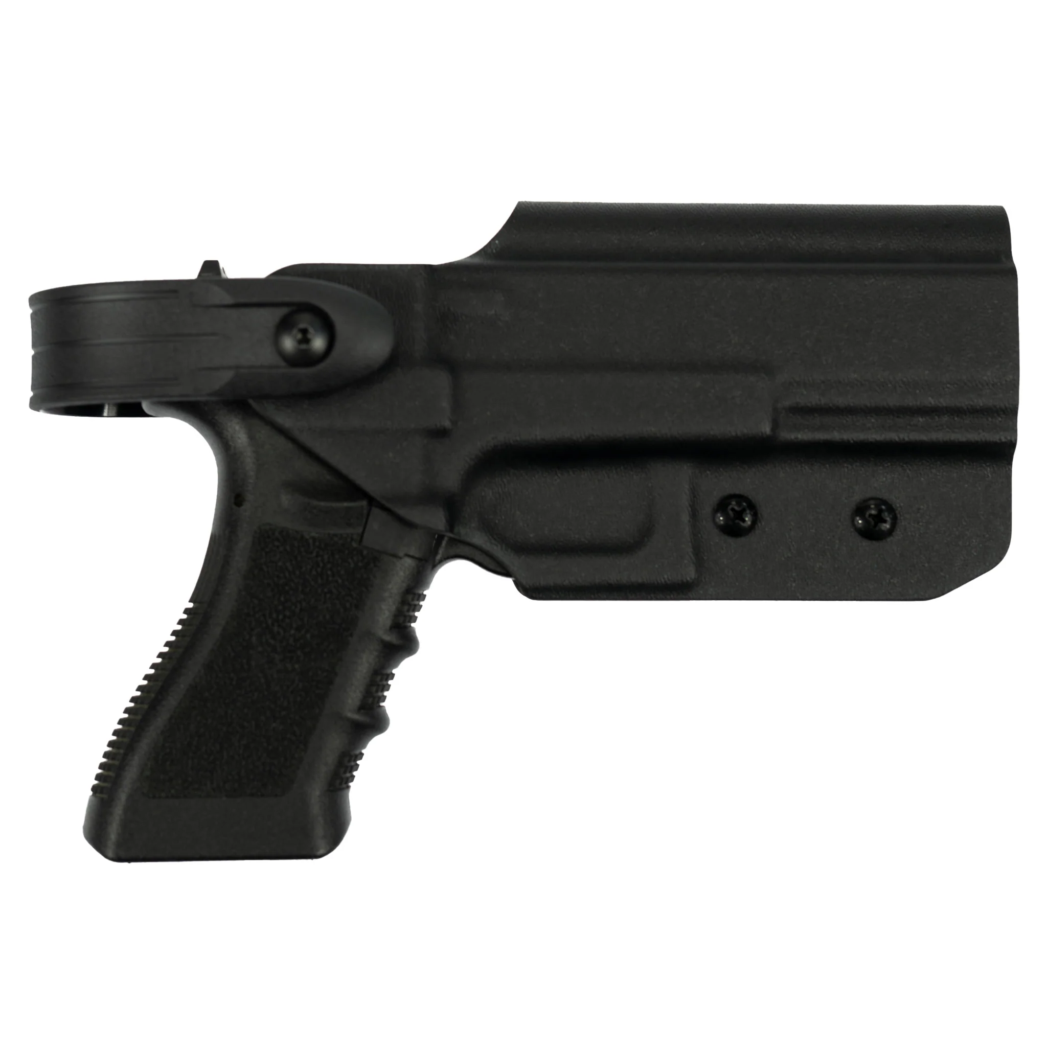 The Kydex Customs L2S (Level 2 Sentry) Series Glock Holster is designed to work with all makes, models and generations of the Glock 17, 17L, 18, 19, 22, 34, 35 and 45. This holsters features a Level 2 locking hood system which adds an additional level of security, as the hood will not allow the pistol to be drawn from the holster without the operator depressing and rotating the hood forward. Constructed from ultra-durable P1 2mm (.08”) Kydex, this holster also features an open muzzle design; meaning it can can also accommodate threaded barrels and muzzle devices that do not exceed the width of the slide or frame, and the use of suppressor height sights to co-witness with slide mounted optics, extended slide release and magazine release controls. One of the primary features of the Level 2 Sentry Holster is its remarkable versatility. The modular hole pattern on the back seamlessly accommodates a variety of mounting options including Safariland, G-Code, Blackhawk, Blade-Tech, S&S Precision plus many more and uses 3x screws to attach. This adaptability makes it the professionals choice for competition shooting, range practice, or duty use. A set of mounting screws come included. Firearm in display image not included.