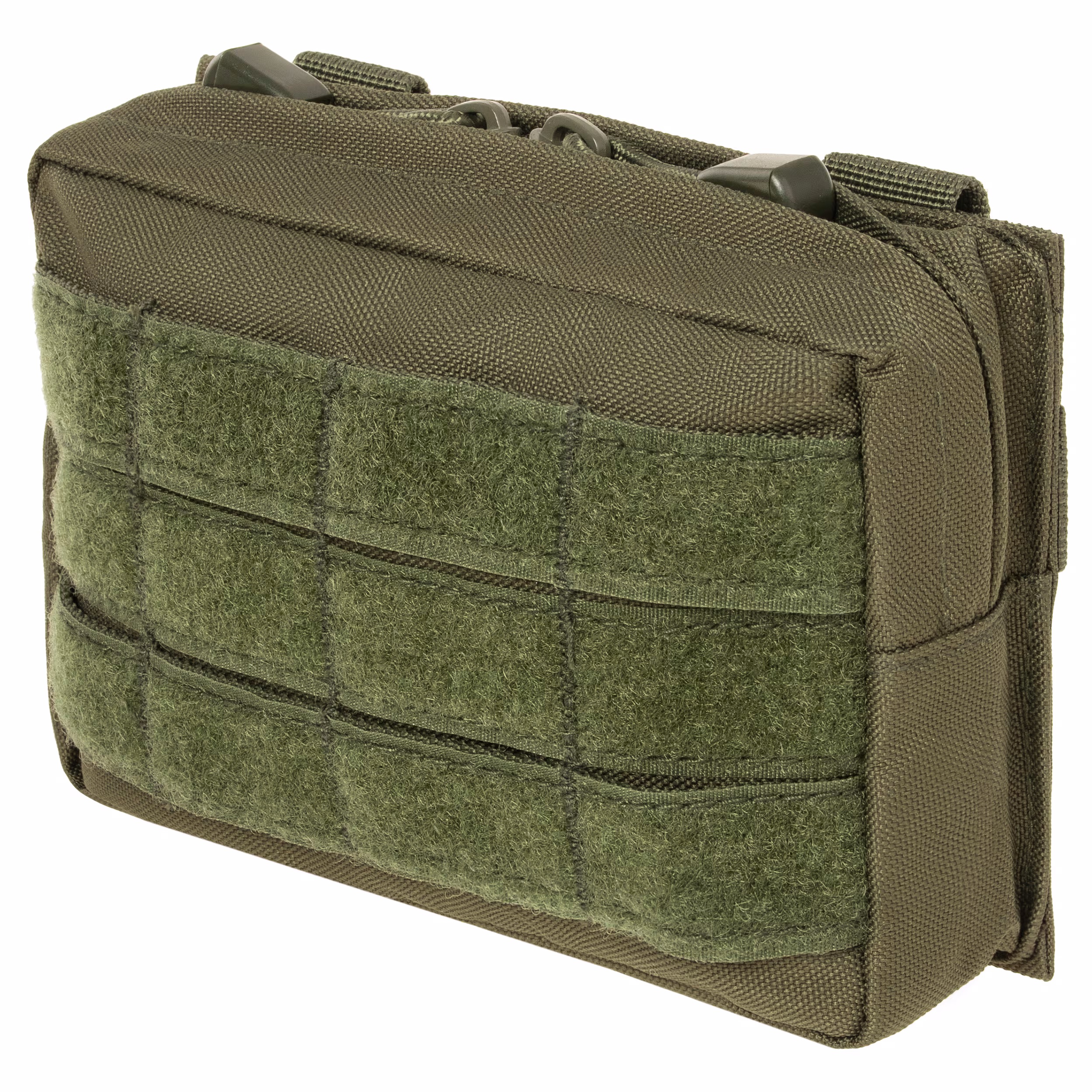 Compact pouch ideal for adding to chest plates, shoulder straps, holsters and belts. Designed with a MOLLE system straps to the rear and Hook & Loop patch on the front for customisation, a double zip closure for convenient access completes this useful accessory. Also features a draining eyelet at the bottom of the pouch itself. The MOLLE compatible fixing system with snap fasteners ensures secure attachment onto any platform.