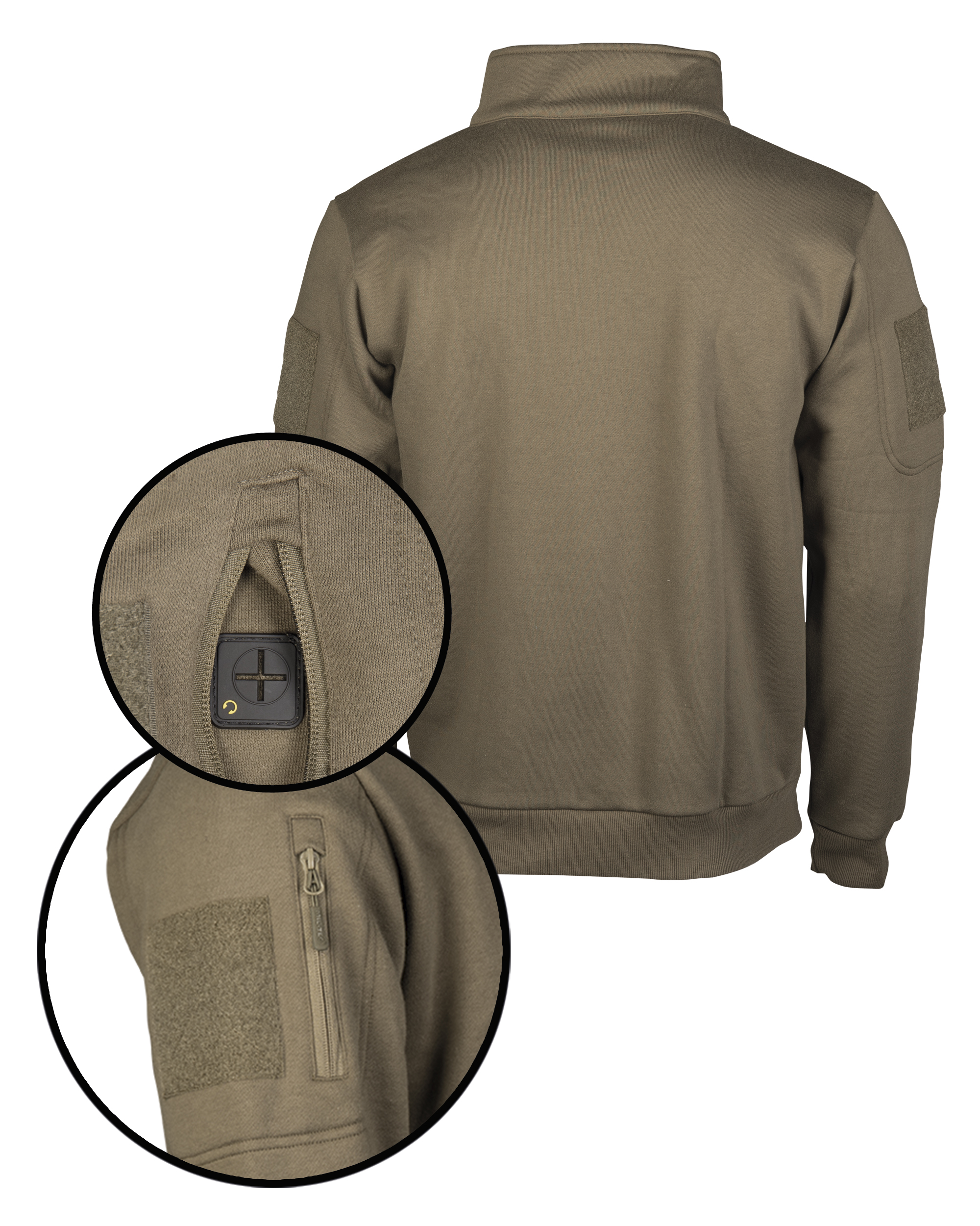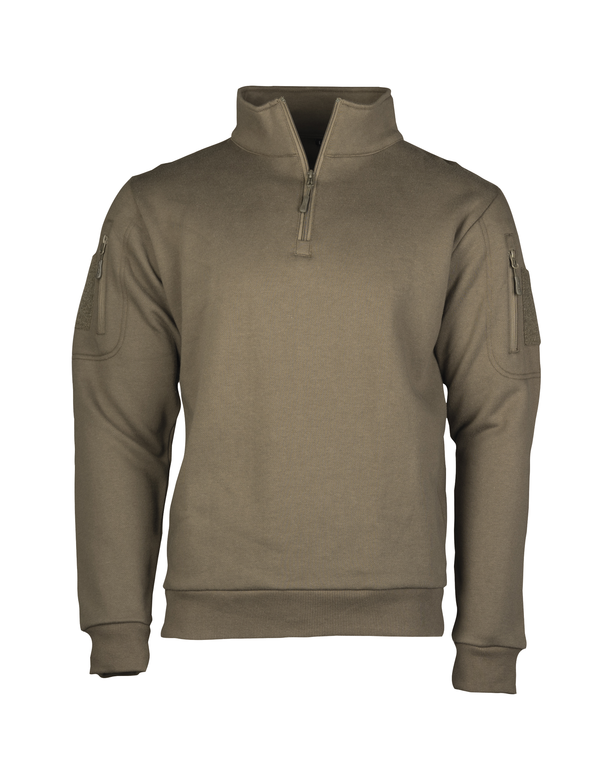 The Mil-Tec Tactical Collared Sweatshirt is a practical outer or mid-layer garment designed to meet the demands of both tactical environments and everyday outdoor wear. Constructed from a durable 60% cotton and 40% polyester blend, it features a soft brushed fleece interior that provides warmth and comfort during extended use in cooler conditions. Its zipped, high-collar design is enhanced with functional elements that include two upper arm pockets with zip closures and internal cable routing ports. Additional features include Hook & Loop panels on each arm for patches and elasticated cuffs to ensure a secure, ergonomic fit.