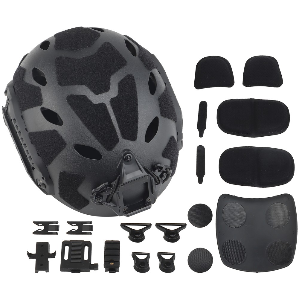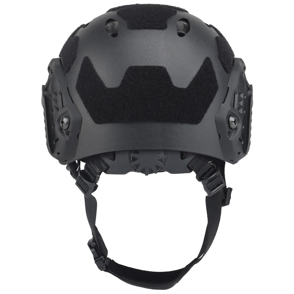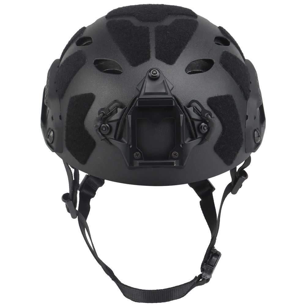 The Nuprol Fast Railed SF Air Helmet is manufactured from durable, hardened Polypropylene and is internally padded with thick sponge cushions for enhanced comfort. Its matte surface provides low reflectivity and is more forgiving to abrasion than traditional most tactical helmets. A forward mount port for cameras/NVGs, as well as side rails for further accessories ensures this helmet is customisable but remains lightweight. The side rails also feature buckle holes that can be used with compatible face protection masks. Internally, a deep-cut band has been provided in the top to allow the helmet to be used with a variety of communication headsets. The top of the helmet features angled ventilation holes and plenty of velcro strips are mounted to the outside for further customisation using helmet covers or pouches. One size fits all, with a maximum head circumference of 61cm.