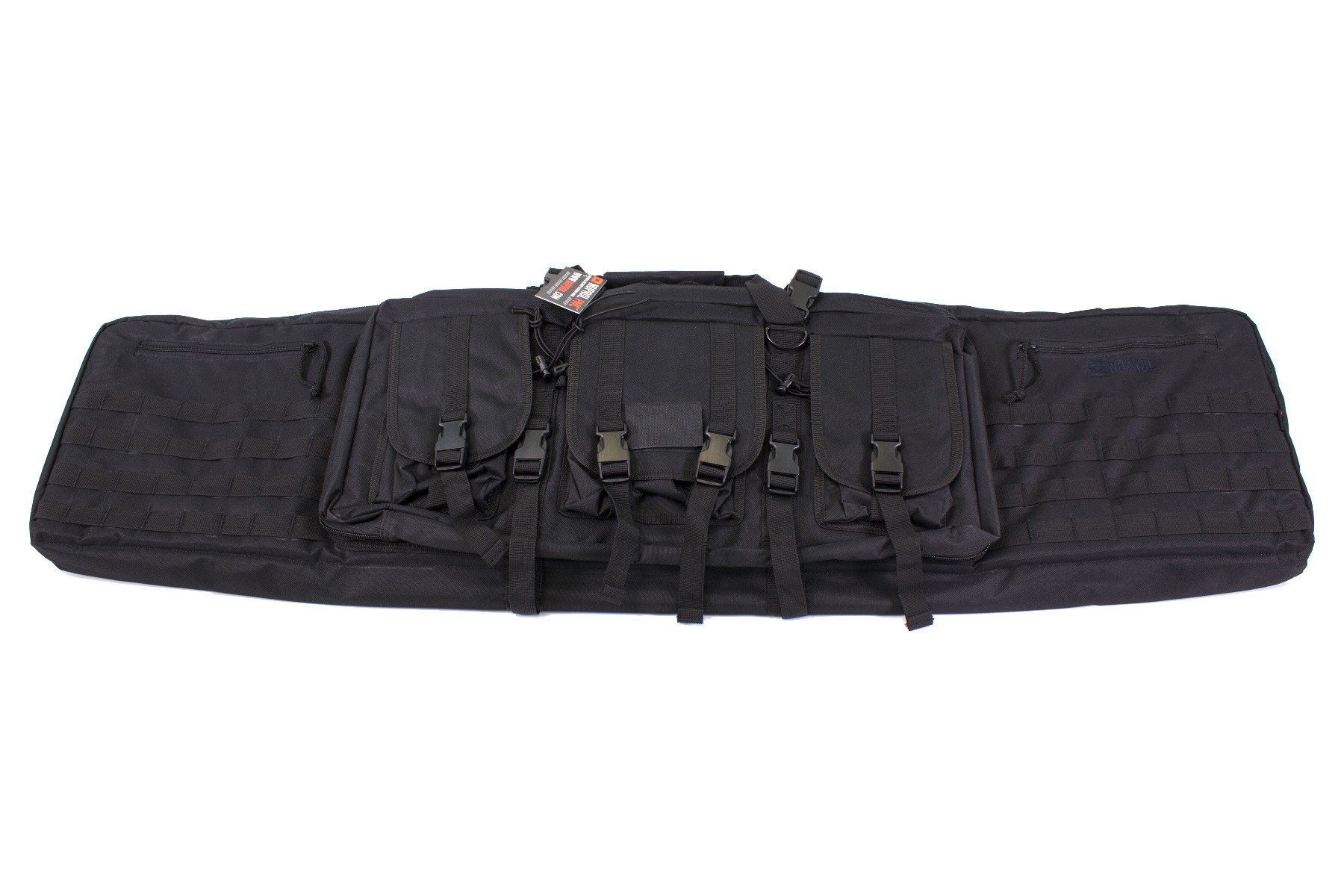The NUPROL PMC Deluxe Gun Bag is a durable, multi-functional and rifle storage solution that can be transported via the integrated carry handle or by wearing the detachable, double shoulder backpack style straps. Constructed from rugged 600D polyester, this bag provides solid protection and functionality with a fully padded main compartment capable of securely housing 2x rifles, separated by a central padded divider and secured with internal Hook & Loop retention straps. The exterior features 3x spacious utility pouches with closures that are ideal for stowing away magazines, ammunition and other tactical accessories. An additional large front compartment contains integrated pockets and zip closure sections suitable for sidearms and optics, whilst MOLLE compatible webbing on either end of the bag itself allows for modular expansion and customisation. External measurements 137cm (L) × 34cm (H) approx.