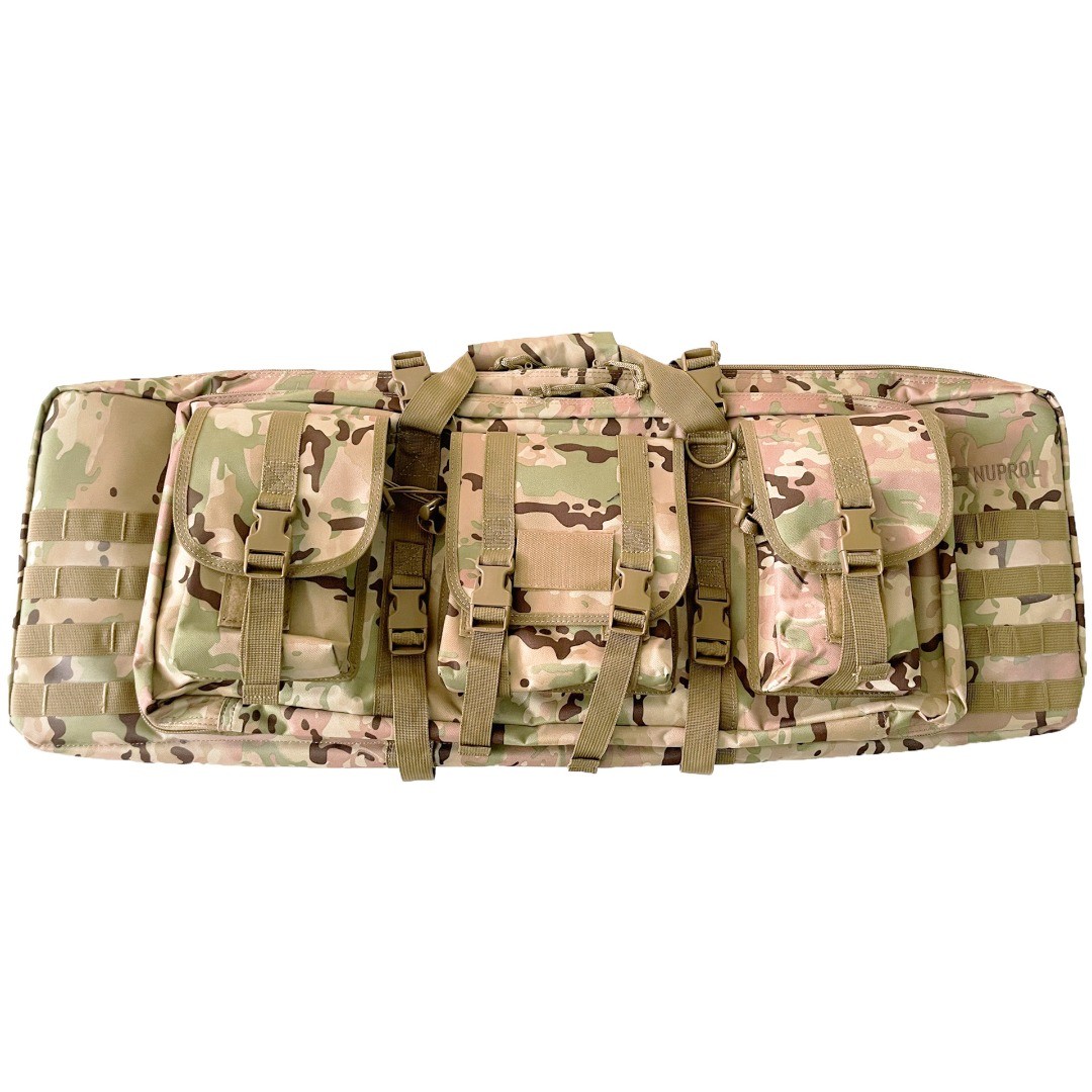 The NUPROL PMC Deluxe Gun Bag is a durable, multi-functional and rifle storage solution that can be transported via the integrated carry handle or by wearing the detachable, double shoulder backpack style straps. Constructed from rugged 600D polyester, this bag provides solid protection and functionality with a fully padded main compartment capable of securely housing 2x guns, separated by a central padded divider and secured with internal Hook & Loop retention straps. The exterior features 3x spacious utility pouches with closures that are ideal for stowing away magazines, ammunition and other tactical accessories. An additional large front compartment contains integrated pockets and zip closure sections suitable for sidearms and optics, whilst MOLLE compatible webbing on either end of the bag itself allows for modular expansion and customisation. External measurements 91cm (L) × 30cm (H) approx.