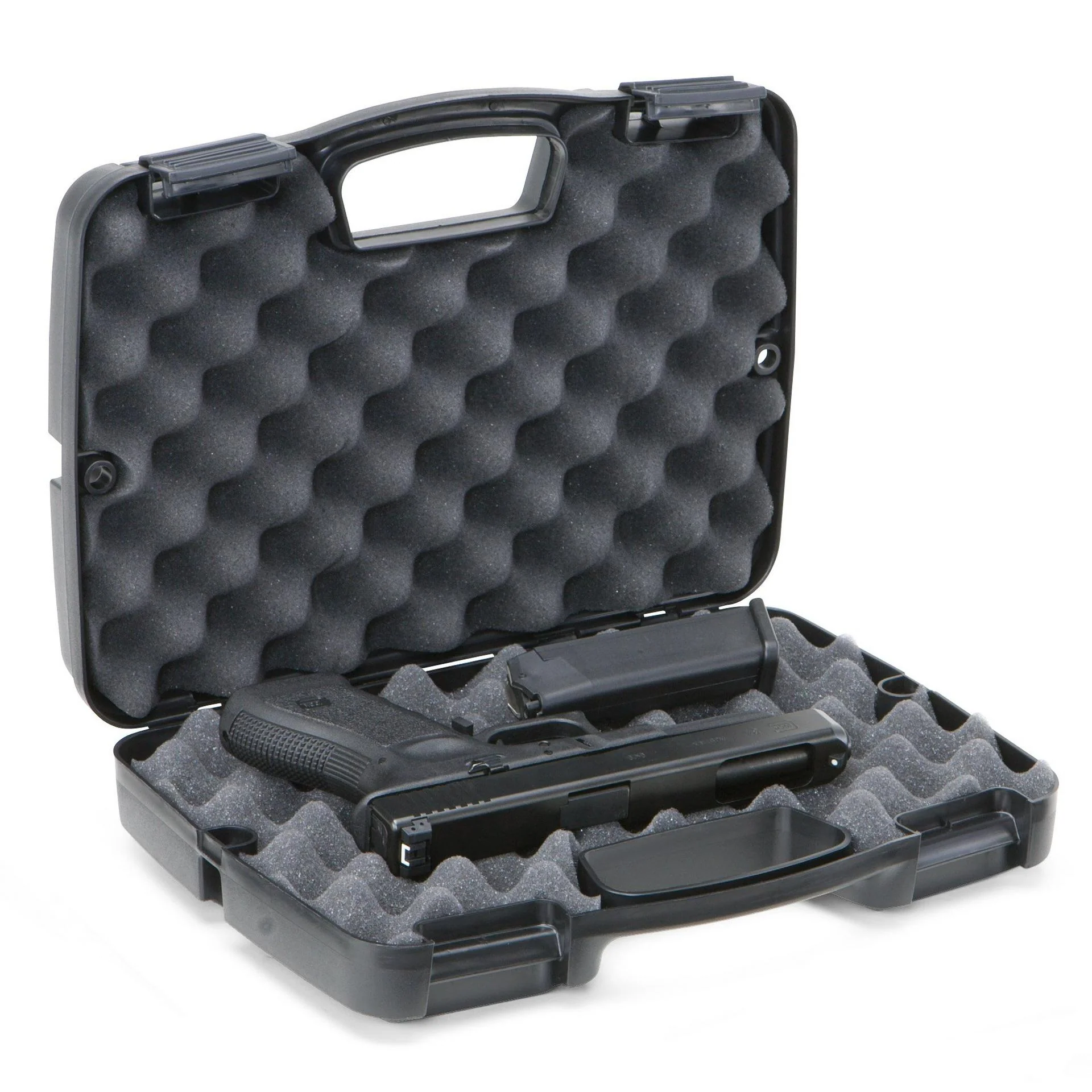 The Plano® Gun Guard™ Pistol Case is a rugged, dependable storage solution engineered with a strong ribbed housing that provides solid all weather protection. Part of the SE Series™, this case is constructed from durable, heavy-duty polymer and features dual latch closures to ensure a firm and secure seal. This case also comes with dual integrated padlock tabs that allow for the attachment of 2x padlocks to further enhance security and compliance with firearm transport regulations. External measurements 34.2cm (L) x 25.7cm (H) approx. Internal measurements 33cm (L) × 24.1cm (H) approx. Firearm in images not included.