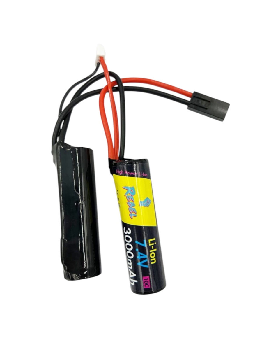 Capacity: 3000mAh Voltage: 7.4v Connector: Mini Tamiya Dimensions: 22x70mm (per stick) Made by Rebel
