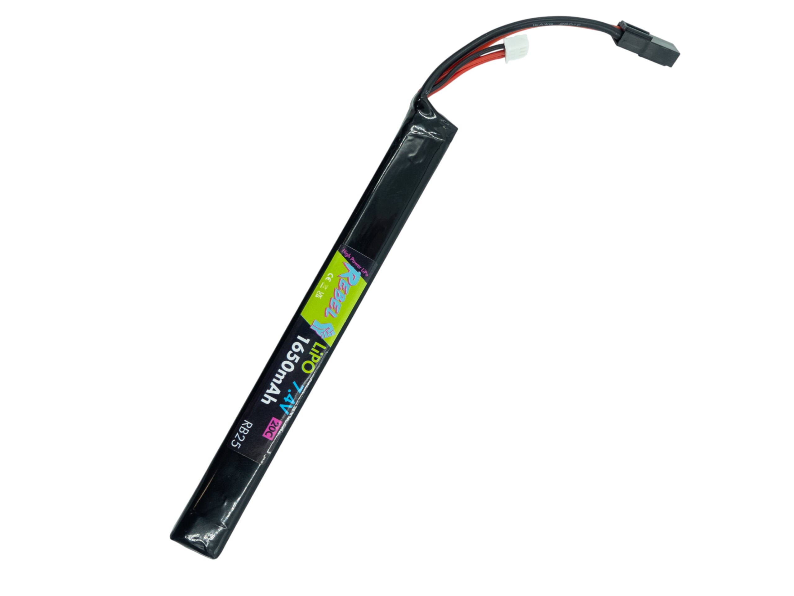 Capacity: 1650mAh Voltage: 7.4v Connector: Mini Tamiya Dimensions: 11x17x164mm Made by Rebel