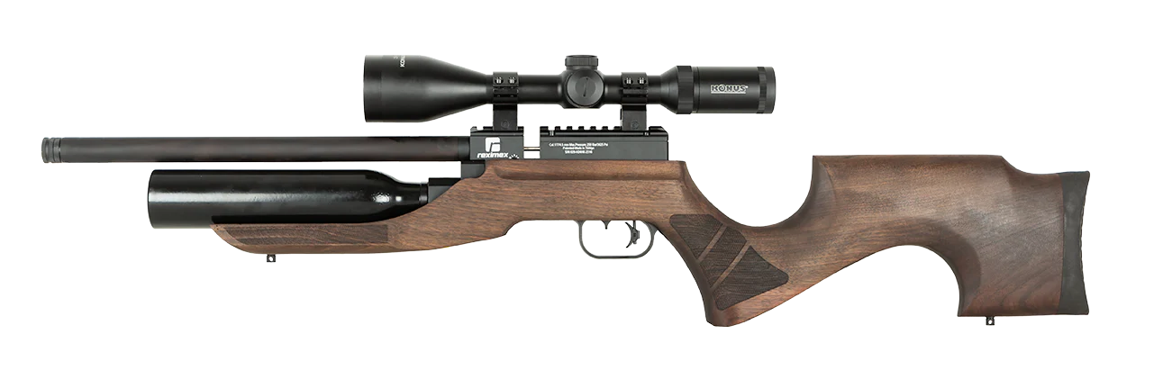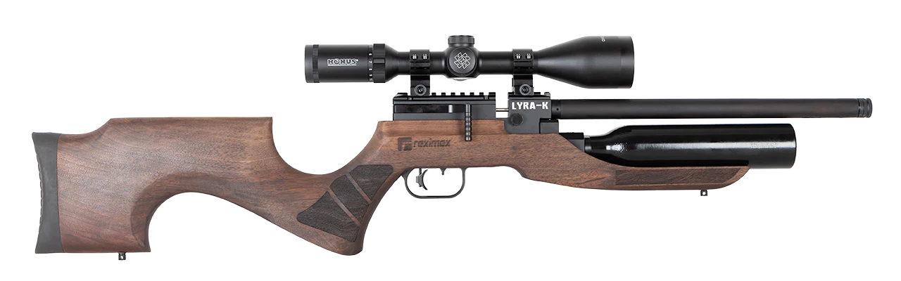 The original Lyra air rifle was so popular and well appreciated that Reximex has now created this fantastic carbine version. This PCP version hosts a 38cm shrouded barrel with a half inch UNF adaptor and a 250 cc buddy bottle. Features a biathlon lever cocking action and power adjuster housed in a beautiful Turkish walnut stock with a rubber butt pad and Picatinny rail to mount scopes or sights. The trigger is adjustable 4 ways so you can set it up to suit your own preference. Comes complete with two magazines. Manufactured by Reximex, Turkey.