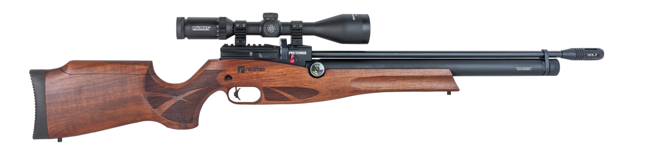 The Reximex Pretensis is a full length sporter air rifle with a 260 cc cylinder. Features a beautifully crafted stock in either synthetic or walnut, an adjustable cheek piece, butt pad and pre fitted swivel screws. A half inch UNF thread also comes standard, plus the cocking lever located on the right side of the rifle. Comes complete with two multi-shot magazines. If you’re in the market for an affordable, accurate PCP with quality finishing and adjustable features, the Pretensis is a strong pick; great for target shooting or small game. It punches well above its price tag in both aesthetic and performance. Scope not included.