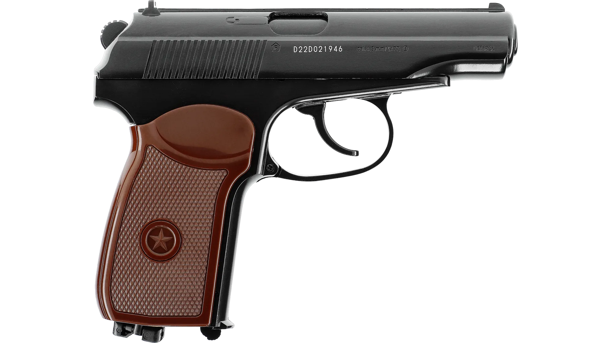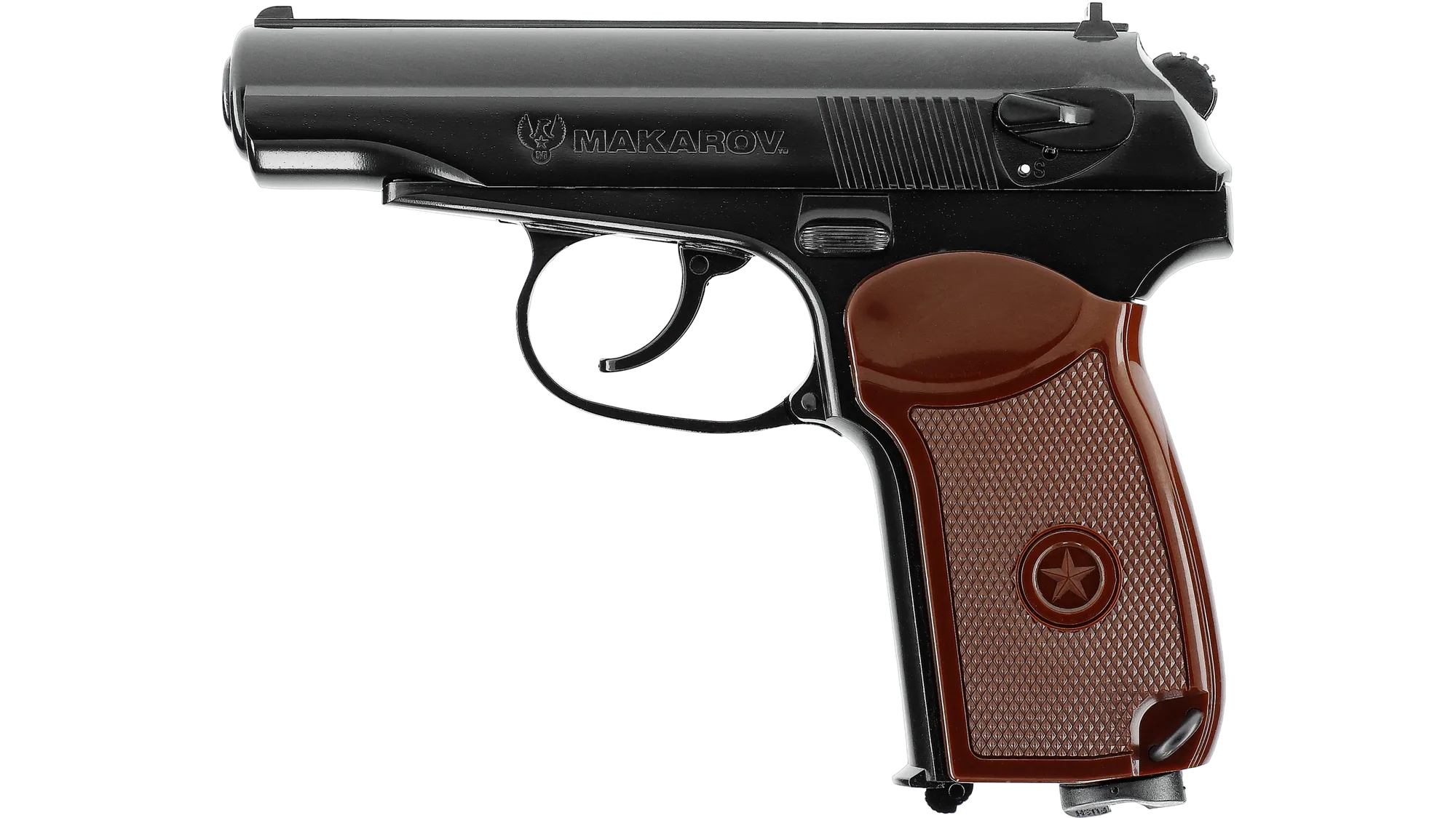 The semi-automatic Makarov, named after its designer, was introduced into the armed forces of the former Soviet Union in 1951. Later a number of countries in the Warsaw Pact adopted this model as an ordinance pistol for police and military use. Like the original, this CO₂ model has all the operating elements and a movable slide. All the main parts of this compact built CO₂ pistol are made of metal. Manufactured by Umarex, Germany.