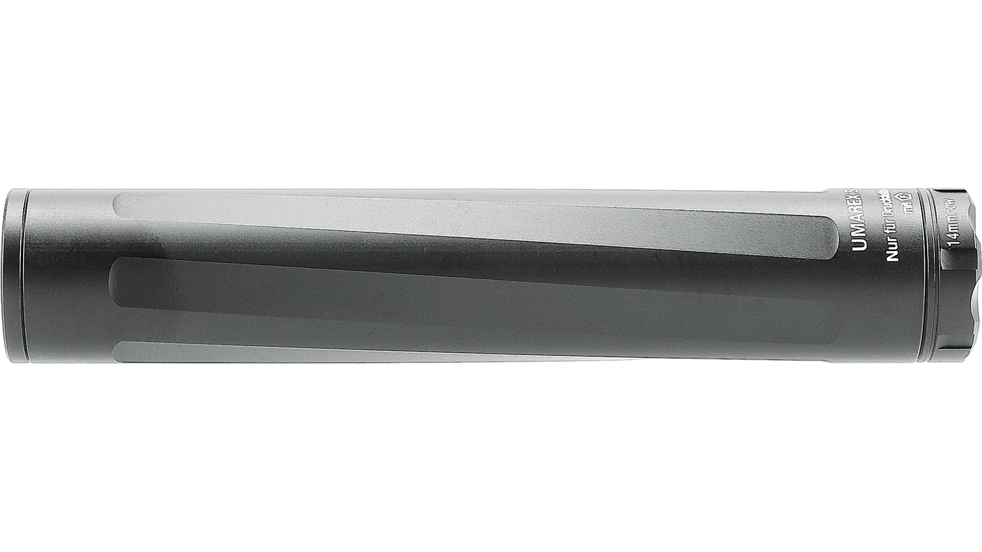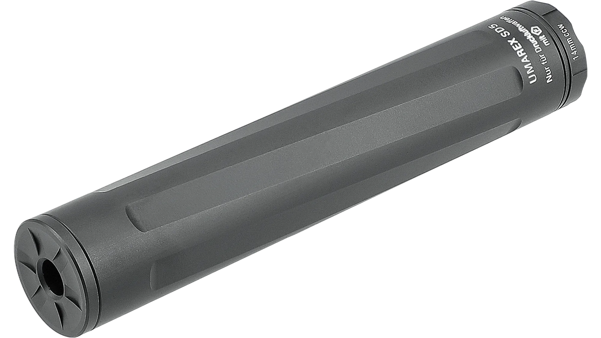 The Umarex SD5 is a precision engineered suppressor designed primarily for pistols and SMGs. It combines a 4x chamber system with a durable, CNC-machined aluminium body to deliver both substantial sound reduction (approximately 20 dB) and a sleek aesthetic. To maximise compatibility with a wide variety of different guns, this suppressor also includes 2x thread adapters (14mm CCW and a 1/2″-20 UNF).