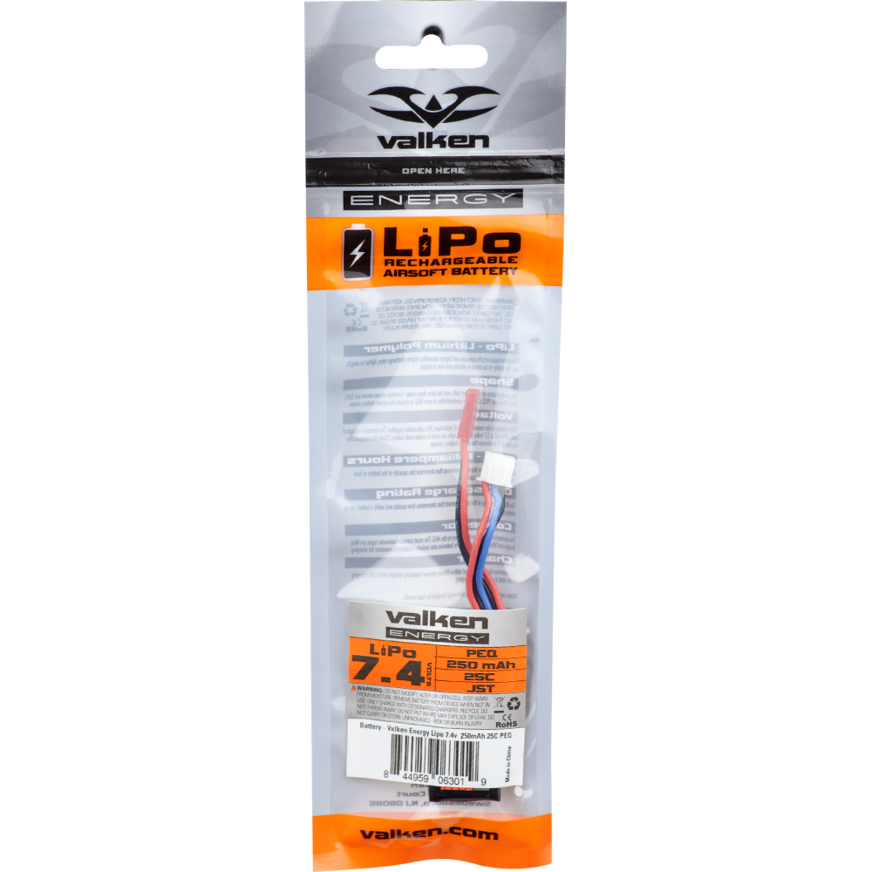 Capacity: 250mAh Voltage: 7.4v Connector: JST Dimensions: 40x21x11mm Made by Valken
