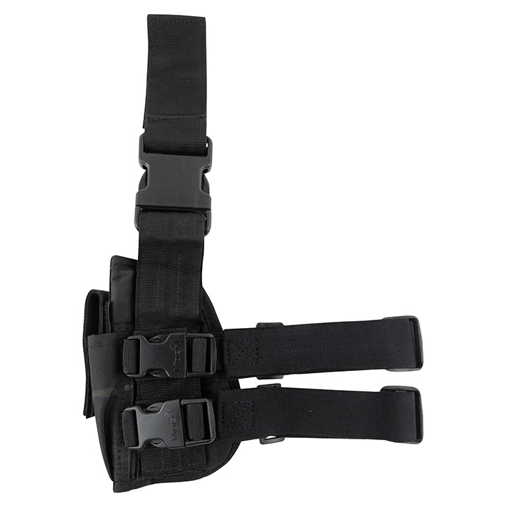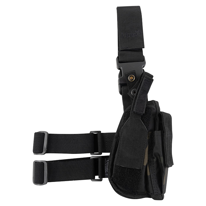 The Viper Drop Leg Holster is a versatile and durable pistol carry solution designed for operators seeking a more modern, reliable alternative to the traditional waist mounted holster. Constructed from durable, high strength 600D polyester it offers full adjustability to accommodate a wide range of regular sized pistols. The holster features a secure retention system with Hook & Loop fastening and a press stud strap to ensure weapon stability during movement. Dual elasticated leg straps and an adjustable vertical belt strap provide a customisable and secure fit, promoting comfort and ease of access. An integrated front magazine pouch adds functionality, making this holster ideal for tactical use.